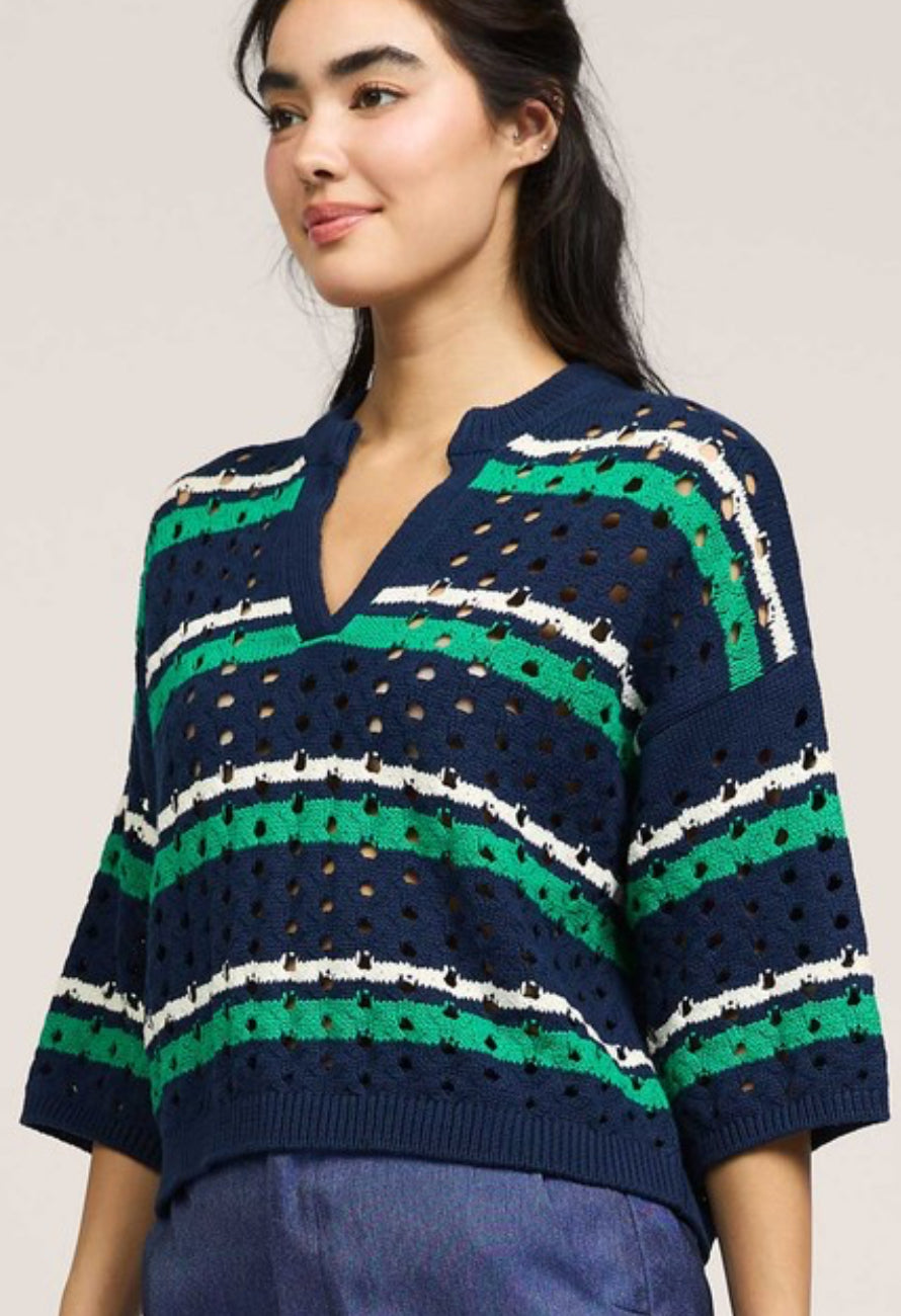 Half sleeves shoulder crochet split neck dropped shoulder knit top.